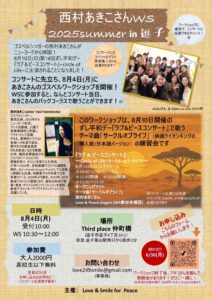 8月10日に行われる、第14回ラブ&ピース・コンサート(in 逗子)に、今回私、AKOがゲストとして参加させていただけることになりました。このコンサートの今年のテーマ、「サークル・オブ・ライフ」(映画ライオンキングの挿入歌)をオープニングアクトで歌うことになり、そのバックで歌ってくれる合唱隊を募集中です!